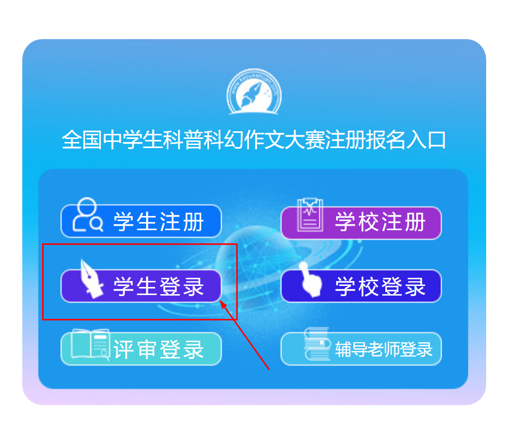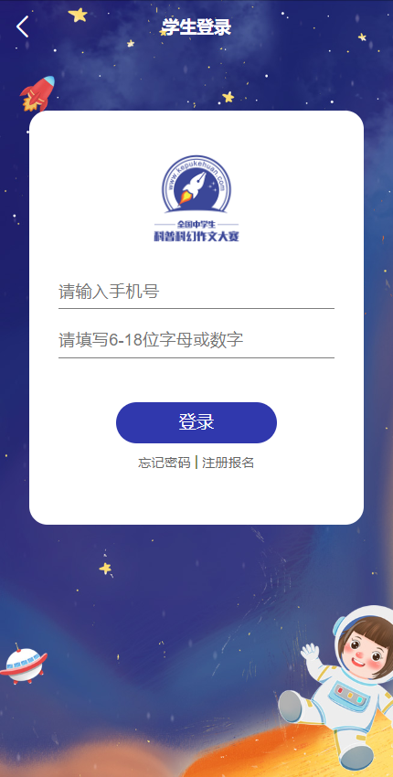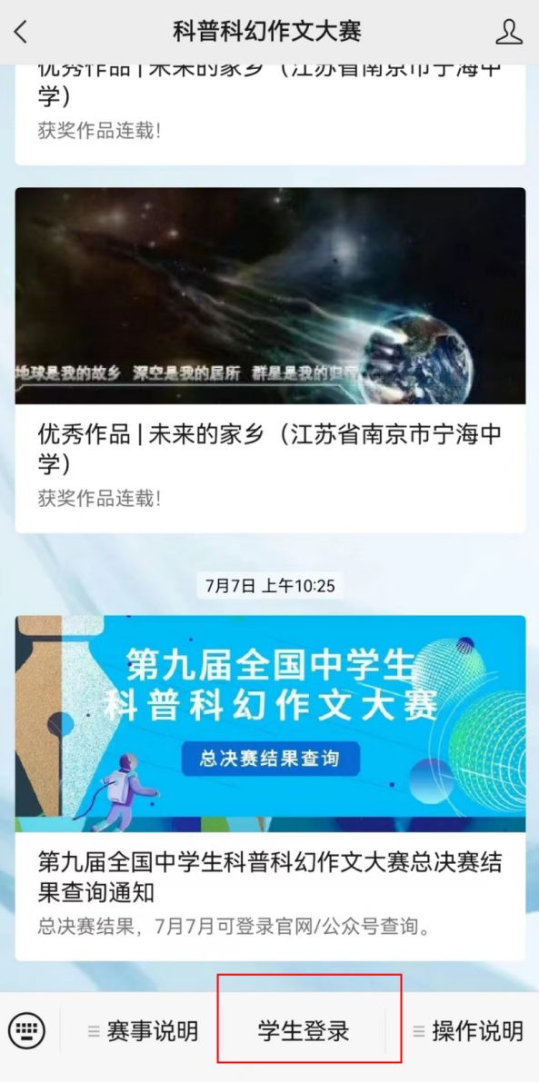 (一)手机端1. 关注官方微信公众号“科普科幻作文大赛”(ID:kepukehuan),通过公众号菜单栏“学生登录”-“学生登录”,可以直接跳转至学生登录界面。