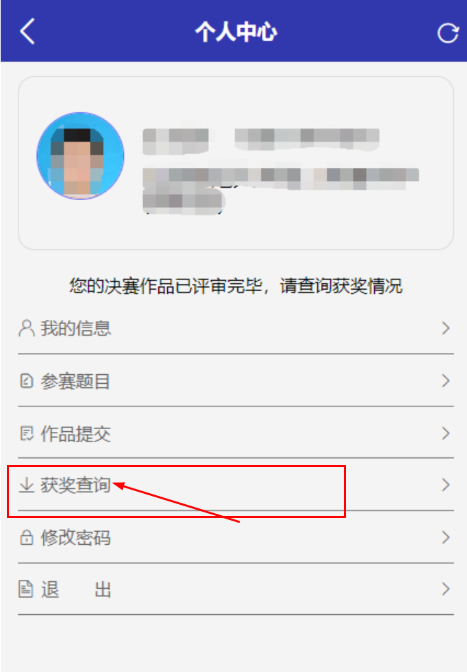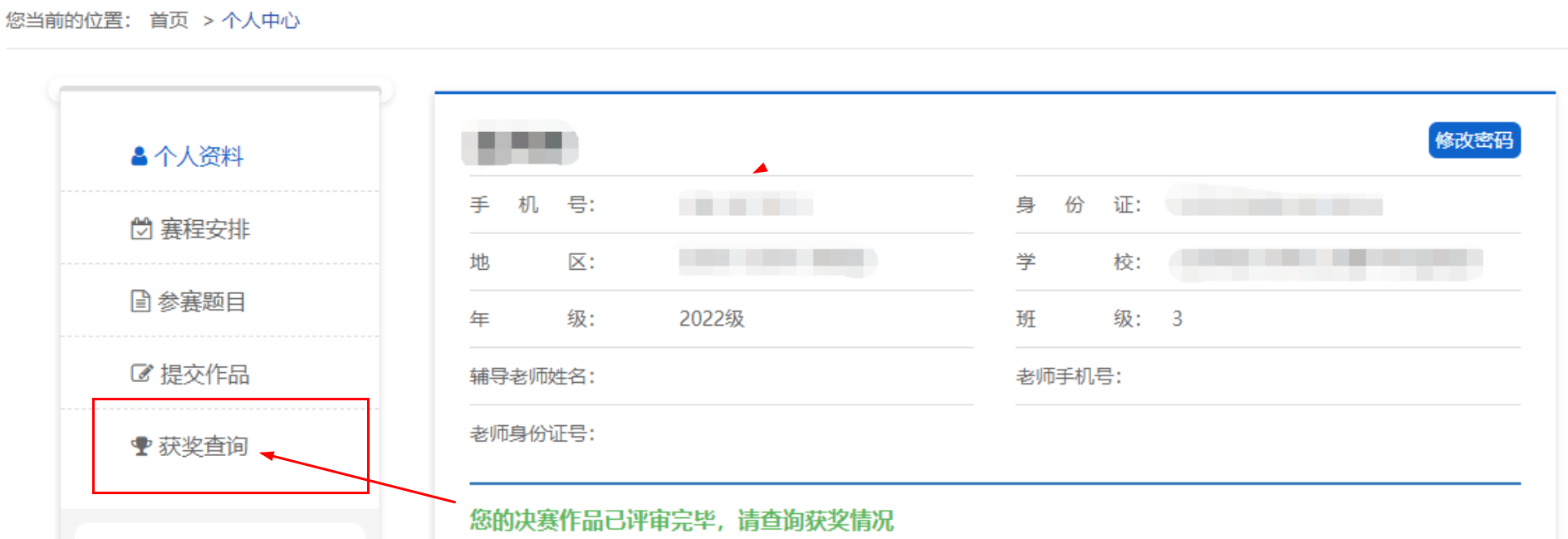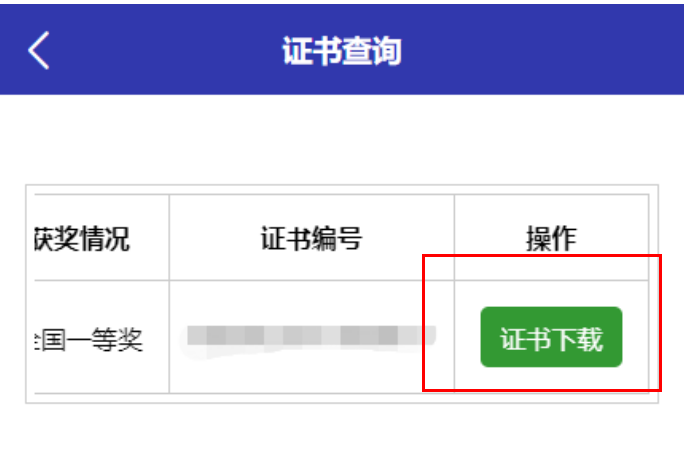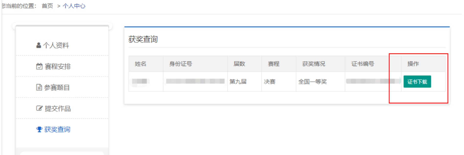 2. 在个人中心内,点击“获奖查询”栏目,即可查看决赛结果。点击右侧“证书下载”按钮下载证书电子版。