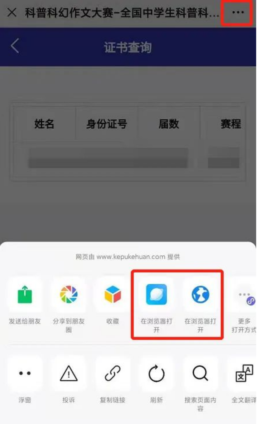 如果“证书下载”按钮没有反应:可以点击右上角的微信菜单按钮,选择“在浏览器打开”后,按上述方法再次尝试;或者在电脑端按下述方法下载。